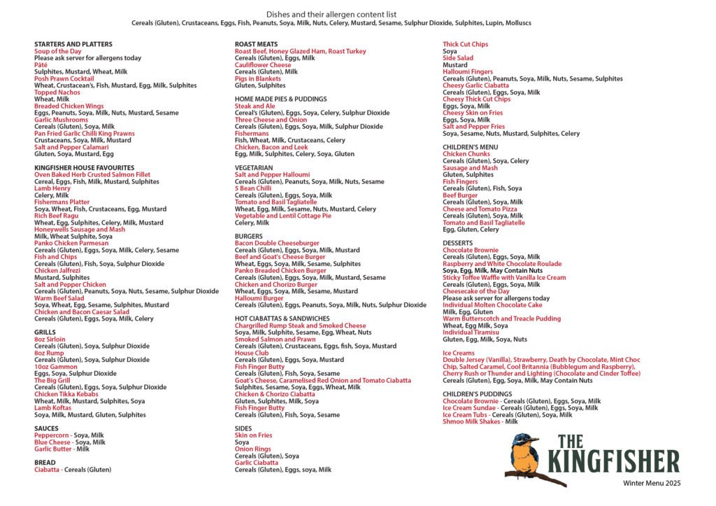 Cereals (Gluten), Crustaceans, Eggs, Fish, Peanuts, Soya, Milk, Nuts, Celery, Mustard, Sesame, Sulpher Dioxide, Sulfites, Lupin, Molluscs